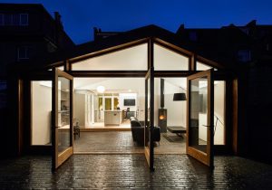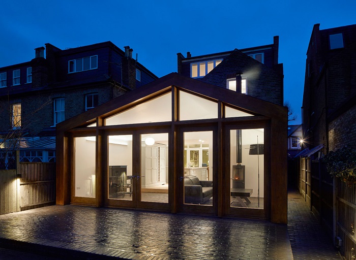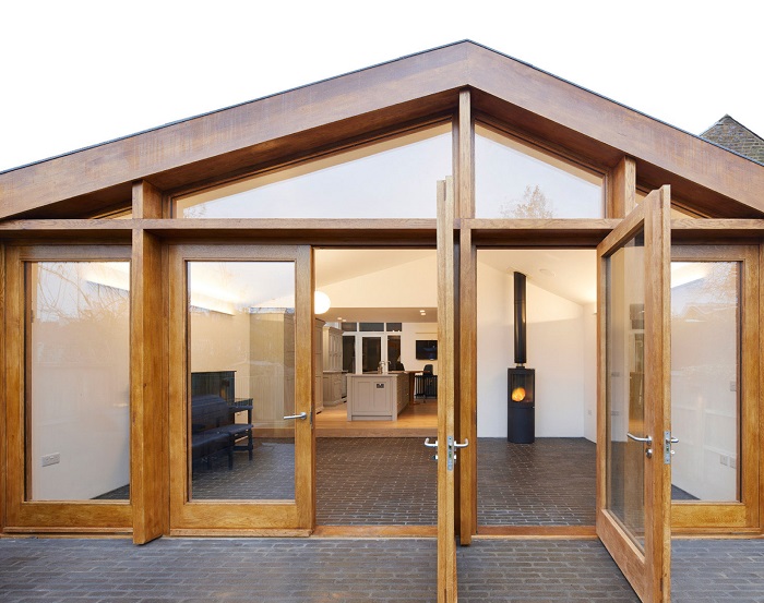 The external front face of the extension has a bespoke oak façade with oak-glazed doors and windows.
