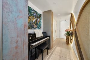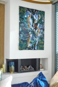 One of the biggest features we added is the feature wall. This runs all the way from the front door, through the entryway and living space. The combination of wood, mirrors, wall fabrics, and soft lighting has created a flowing piece of art that lengthens the property. The darker wooden waves break up the white walls and add character to the room. The mirrors help bounce natural light through the entire property during the day, and the soft light gives the flat a good ambiance at night. Adding even more to the ambiance, we constructed a built-in fireplace next to the balcony doors.