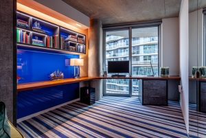 This office is not only functional but has some great design features too. The feature wall behind the desk uses blue glass to again spread light. Whether from a desk lamp or the sunshine from the window, this will light up the room and give it a subtle pop of colour. The concrete column also feels like an interesting design feature due to the bespoke desk.